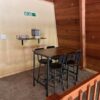 This is a 6 person two story cabin. The cabin has one bedroom with a queen bed upstairs, with an adjoining king bed in the upstairs loft. There also is a bedroom with a king bed on the main level. It has a full kitchen, living room, electric fireplace, air conditioning and a beautiful view of the foothills of the Cascades. Two bathrooms. (Pool towels not included)